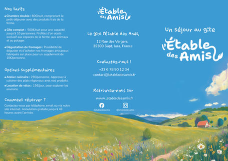 Le projet comprend une petite charte graphique définissant les bases de l'identité, des packagings pour les produits locaux (comme les fromages artisanaux), ainsi que des supports print, tels que des brochures et des dépliants. Chaque élément a été pensé pour refléter les valeurs d'authenticité et de convivialité propres au gîte, tout en mettant en avant son cadre exceptionnel et ses offres uniques.